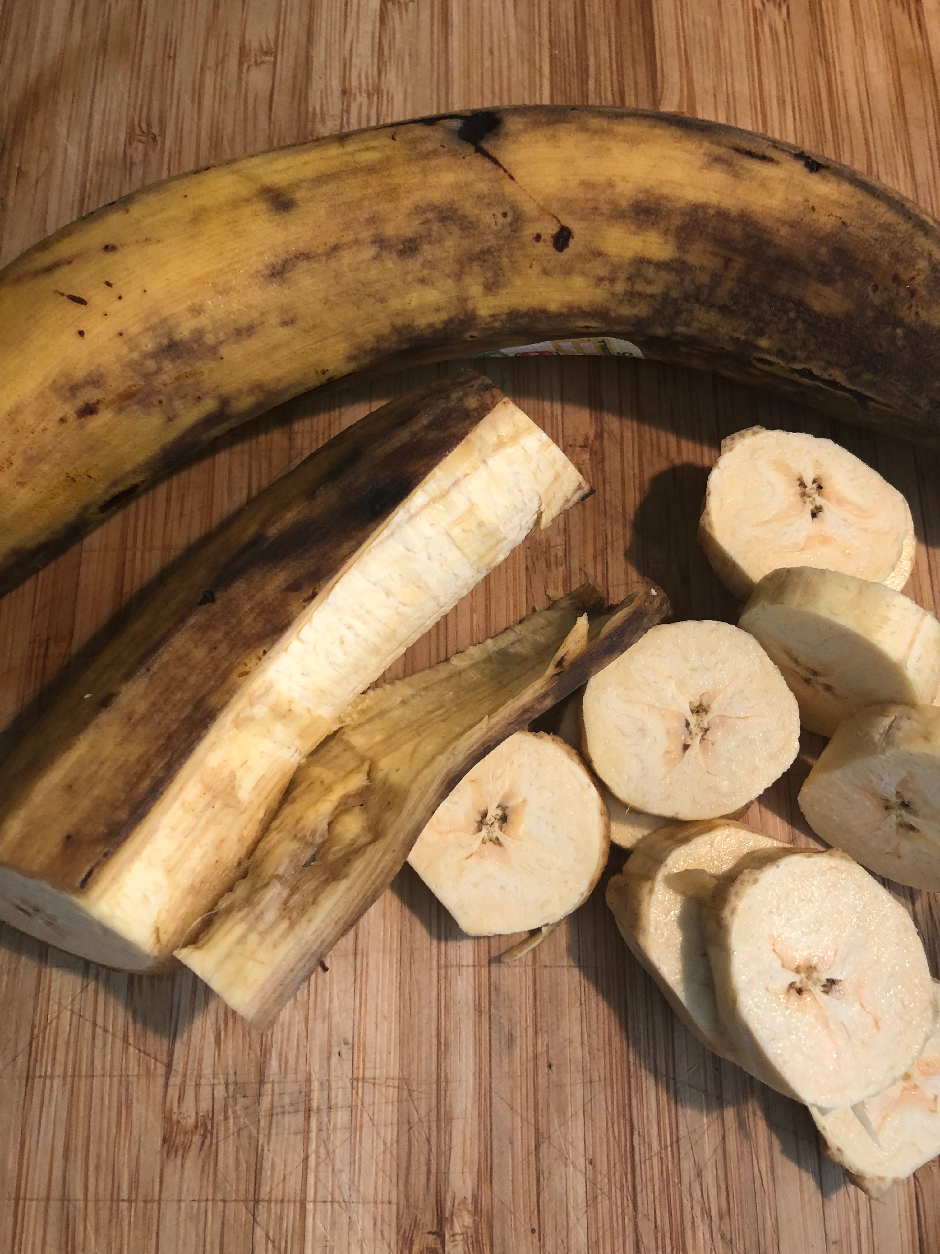 - Peel and slice the plantains (I like about 1cm thick slices). This was a ripe plantain. It was a bit on the sweeter side since it had turned yellow. A green one will be less sweet. Either will work for this.